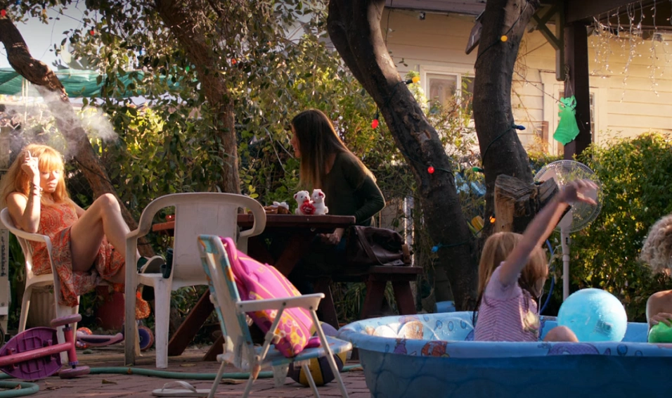 It’s a small house with a cluttered backyard in which a tree grows. Clothes are hanging on a line to dry, and Christmas decorations have been put up.