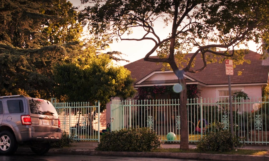 It’s a pink one-story house in a residential neighborhood. Along the front, there is an aqua-colored wrought iron fence, and bougainvillea grow around the porch.