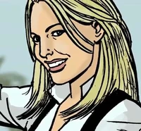 She’s an attractive woman in her 30s with blue eyes, blonde hair, and high cheekbones. Her work attire consists of black pants with a black vest over a white, button-up shirt.