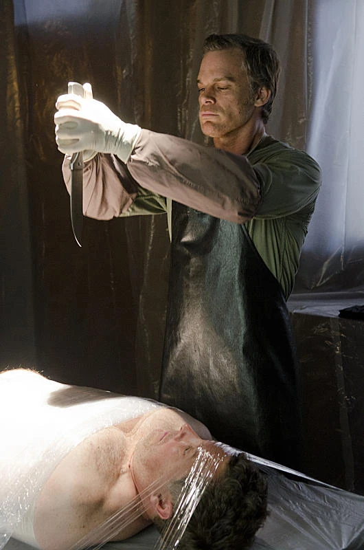 Dexter typically stabs his victims in the heart, but he also uses other methods, such as sawing through a neck, beheading, or slashing / stabbing a carotid artery.