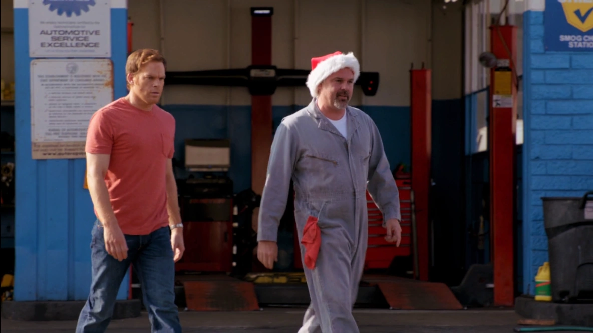 Next, Dexter tracks down Debra’s car. A mechanic, wearing a Santa Claus hat, leads him over to the vehicle.