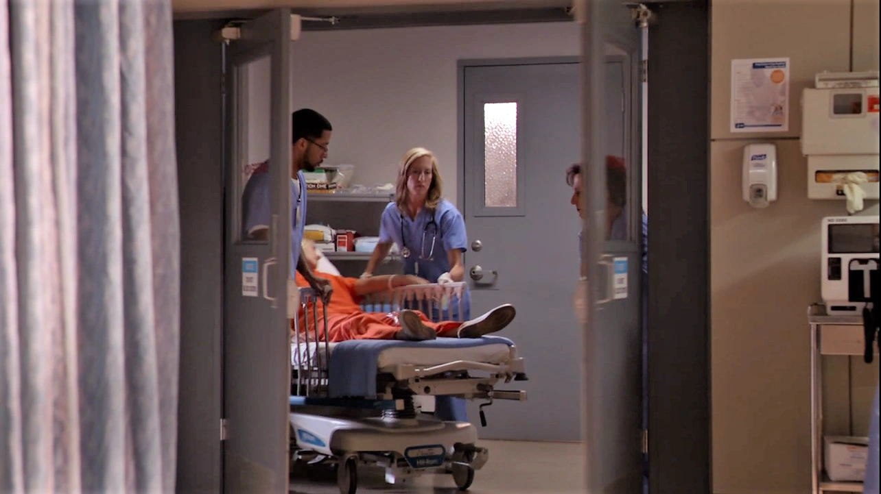 Upon arrival, two ER nurses quickly take over. They attach tubing and monitors to Hannah and order a MRI with contrast. A deputy orders Hannah’s next of kin to be notified.